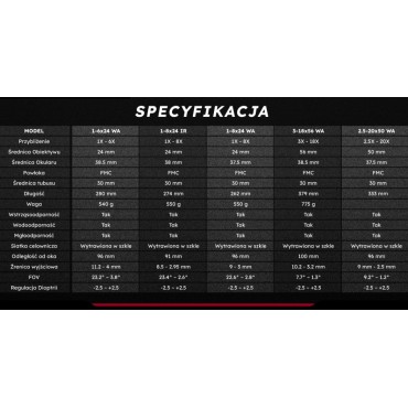 - Zakres powiększenia: 2,5–20x.